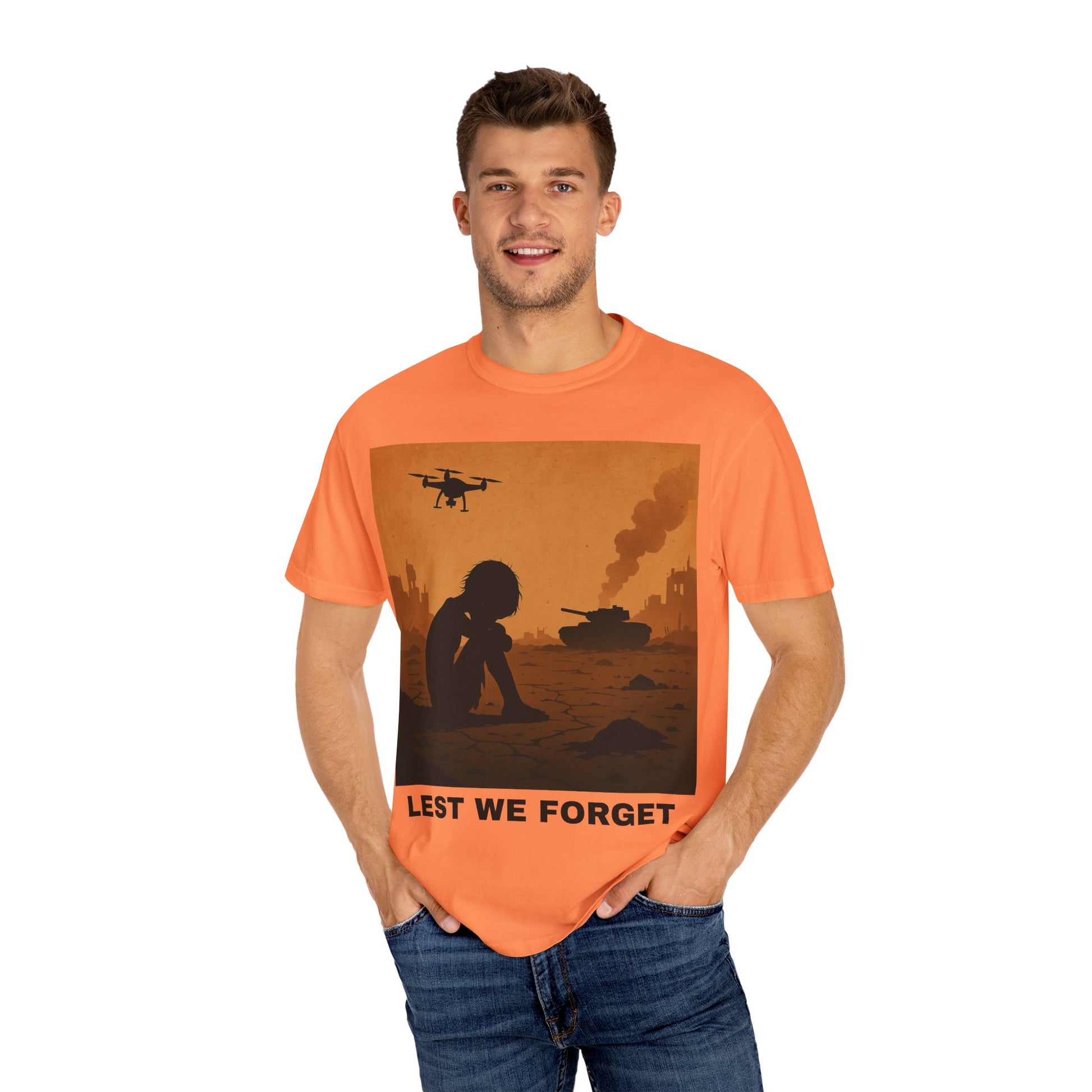 Unisex Garment-Dyed T-shirt, Lest We Forget Tee, Casual Wear, Memorial Day Shirt, Thought-Provoking Graphic Tee